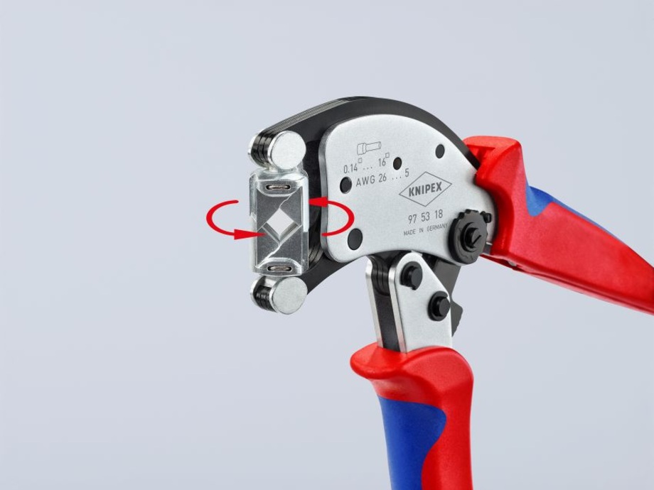 The 360-degree rotatable crimping head of the crimping tool Twistor16 from Knipex ensures flexibility and saves time during electrical installation. When rotated, the crimping head snaps into eight common working positions. Since the square crimping profile automatically adapts to the different cross-sections within the capacity range between 0.14 and 16 square millimetres, no manual adjustment is required beyond choosing the working direction. Incorrect crimping due to the wrong crimping bits is ruled out.