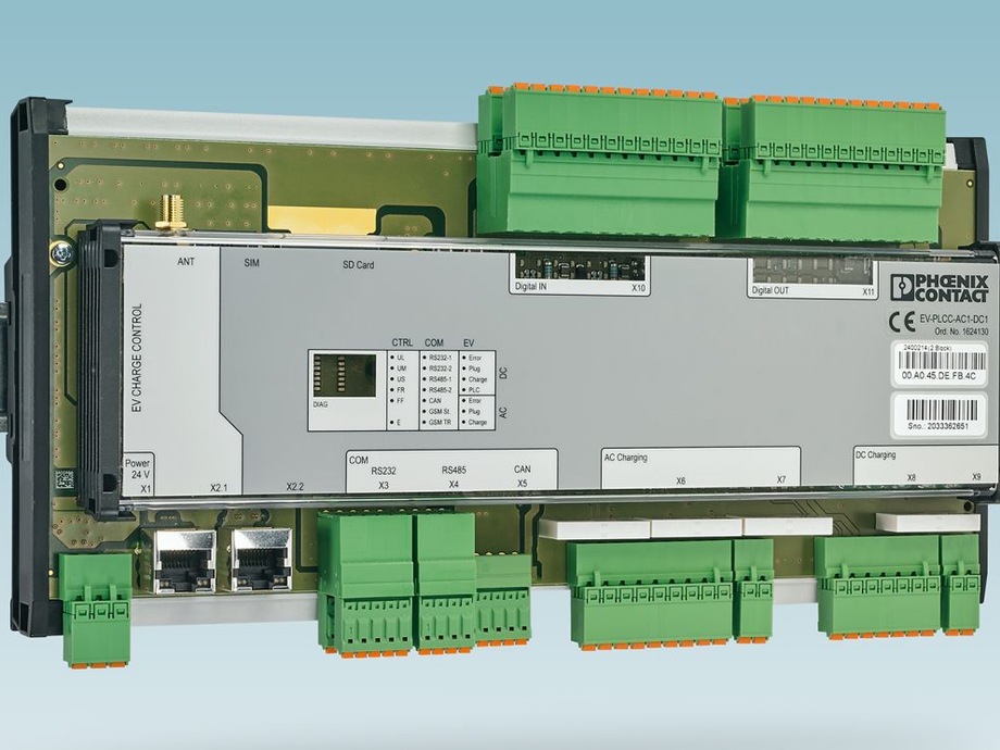 Two independent charging points can be operated via the EV Charge Control Professional by Phoenix Contact: one for fast DC charging in accordance with DIN Spec 70121 and another for conventional AC charging in accordance with IEC 61851-1. The EV controller handles communication and control within the charging station as well as visualisation.
