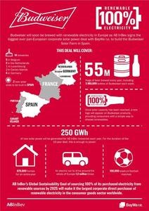 AB InBev beers, including Budweiser, the world’s most valuable beer brand, will soon be brewed with renewable electricity throughout Europe as AB InBev inks a deal with global renewable energy developer, BayWa r.e., to purchase 100% renewable electricity for its European brewing operations.