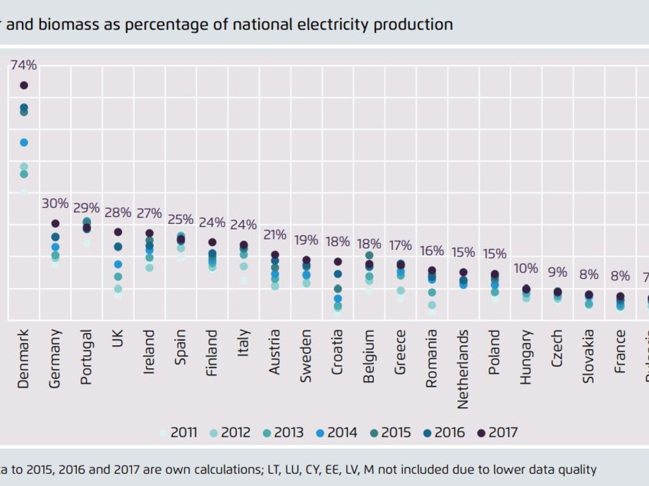 The analysis also shows that the share of renewables in the various EU countries is growing very unevenly. In the past three years, for example, the United Kingdom and Germany have contributed to more than half of the increase in renewables - wind energy in particular is playing a major role here. In Germany, in 2017, 30 percent of the electricity was generated from wind, solar and biomass, and 28 percent in the United Kingdom. The strongest percentage growth was recorded in Denmark: in 2017, 74 percent of the electricity produced there came from wind, solar and biomass, a rise of seven percentage points. The strong growth in a few countries is contrasted with very low growth in many other EU countries: anaemic growth throughout the decade can be observed in Slovenia, Bulgaria, France, Slovakia, the Czech Republic and Hungary. Other countries had good growth at the start of the decade, but then gave up on renewables with almost no growth in the last three years, like Spain, Italy, Portugal, Belgium and Greece. Exceptions are Croatia and Romania, where the share of power from wind, solar and biomass has been growing since 2011 from low single digits to 18 (Croatia) and 16 percent (Romania), respectively. Six countries still had less than 10 percent of their electricity production from wind, solar and biomass in 2017: these are Slovenia (4%), Bulgaria (7%), France (8%), Slovakia (8%), Czech Republic (8%) and Hungary (10%).