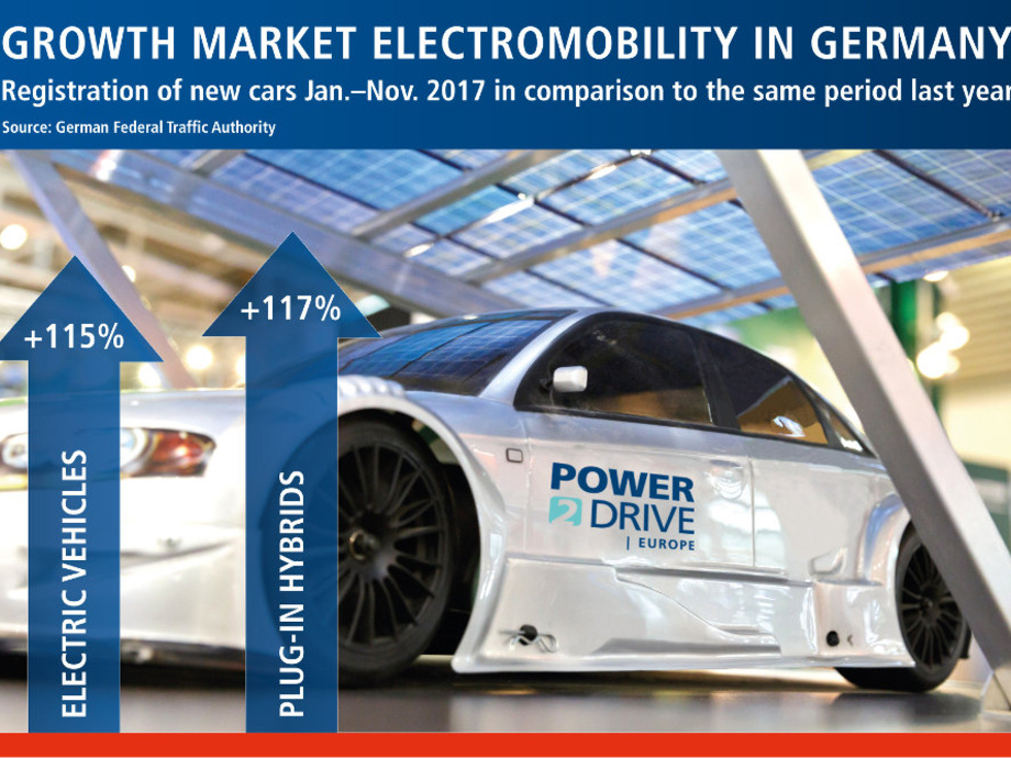 Clean mobility solutions are on the rise. According to the German Federal Motor Transport Authority, 21,644 new electric vehicles and 26,560 plug-in hybrids were registered in Germany between January and November 2017 – representing growth of around 115 percent in each sector compared to the same period in the previous year. By 2030, up to 50 million electric cars will be on the roads worldwide, according to an estimate by the International Renewable Energy Agency (IRENA).