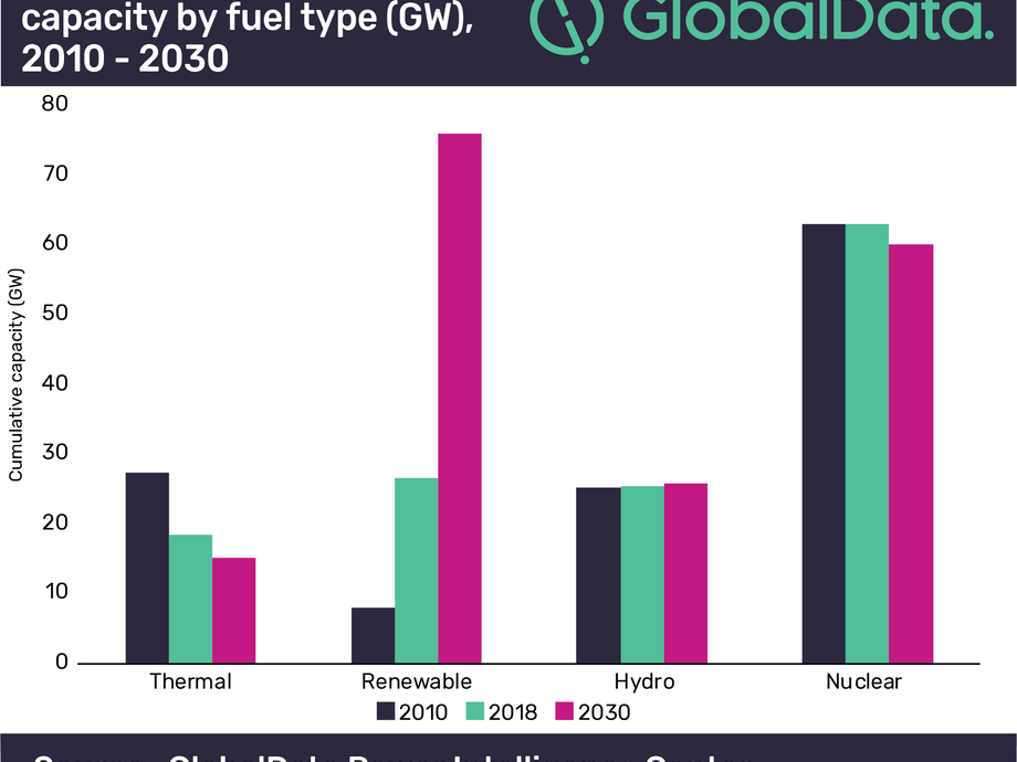 GlobalData’s latest report, 'France Power Market Outlook to 2030, Update 2019 – Market Trends, Regulations, and Competitive Landscape', reveals that in 2018 nuclear power dominated the capacity mix by 47.2%, followed by renewable energy, hydropower and thermal power. In the non-hydro renewable energy mix wind contributed 56.7% share followed by solar photovoltaic (PV) with 35.6% share.