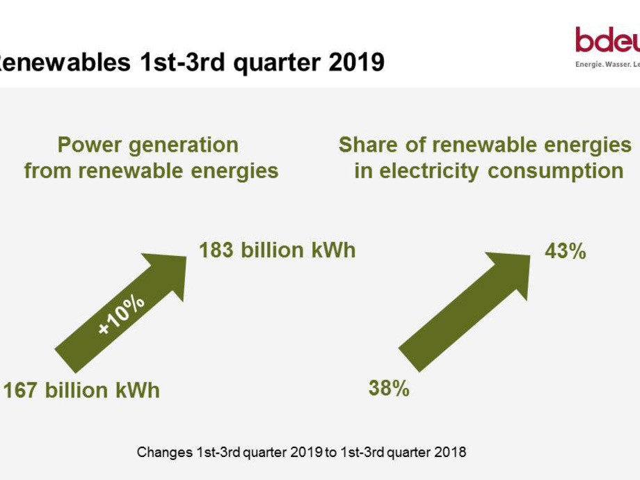 This is an increase of nearly five percentage points compared to the same period last year (38.1 per cent), this is a new record. Notably, the share of renewables has climbed as high as 52 per cent during an unusually windy March. The Centre for Solar Energy and Hydrogen Research Baden-Württemberg (ZSW) and the German Association of Energy and Water Management (BDEW) arrived at these figures in an initial assessment. If wind and solar energy yields in the fourth quarter are in line with the last few years’ average, renewables’ share could amount to a good 42 per cent in 2019.