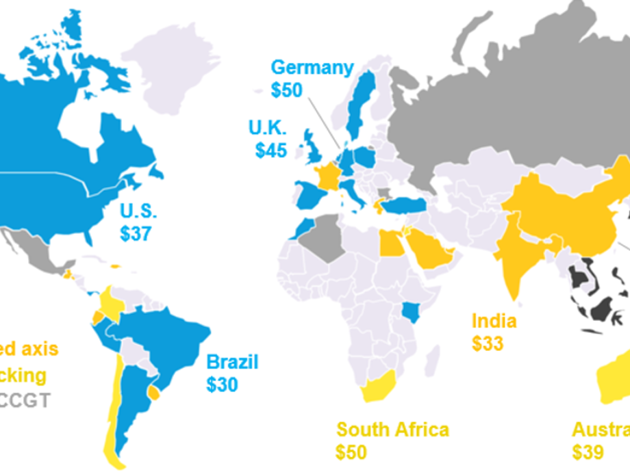 Globally, we estimate that some of the cheapest PV projects financed in the last six months will be able to achieve an LCOE of $23-29 per megawatt-hour, assuming competitive returns to their equity investors. Those projects can be found in Australia, China, Chile, and the U.A.E., where they will challenge the existing fleet of fossil fuel power plants.