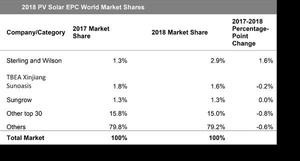 In 2018, the non-residential PV market outside of China expanded by a robust 34 percent, mainly as a result of growth in India, Australia, Europe, the Middle East and Latin America. This has enabled established EPC providers to grow globally, but also has opened up opportunities for local entrants. Seven of the 15 largest companies outside of China—including Sterling and Wilson, Risen Energy, ACS, Acciona and BayWa—installed projects in more than one region, an indication of the growing internationalization of the EPC market.