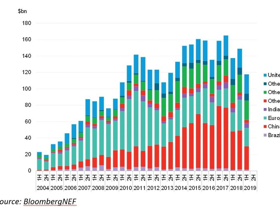 The plunge in activity in China, as the country shifts this year away from government-set tariffs to auctions for new wind and solar capacity, also depressed the 1H 2019 global investment figure – to $117.6 billion, down 14% compared to the first half of 2018.