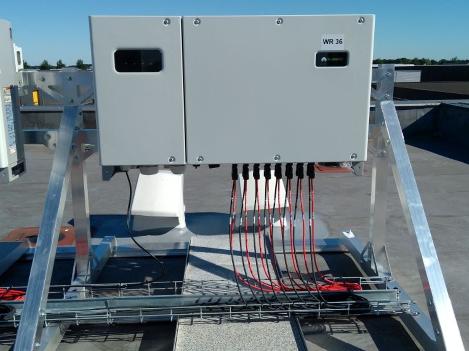 The inverter bank is suitable for indoor installation as well as for open areas and flat roofs with an inclination of up to five degrees. Like all of PMT’s products, the INB V8 can also be mounted without penetrating the roof cladding. Certificates of stability as well as of the pressure resistance of the insulation of the roof are also available.