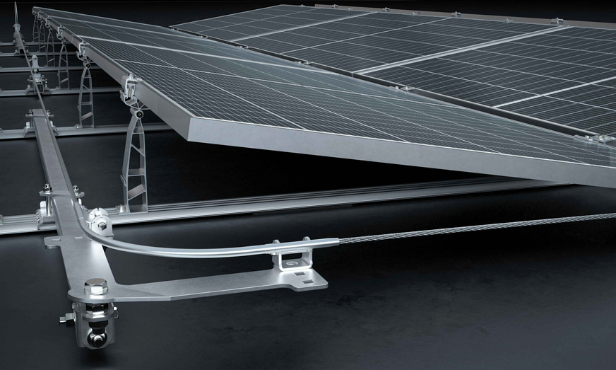 For fall protection, we work together with our partner Innotech from Austria. With the solution we have developed, you can choose between a rail-based and a rope-based version. While the rope-based safety system is cheaper, the rail-based version offers more flexibility. It is important that sufficient ballast – at least four modules or 600 to 800 kilograms per module field – is available. In the case of very low wind loads, we provide additional ballast if necessary. This prevents a person from falling to the ground.