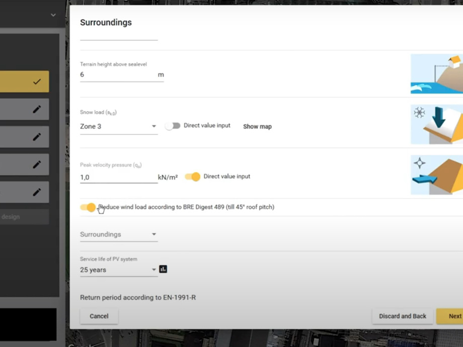 Even the matter of safety is in good hands with Renusol: Every project report contains structural data on all components. Snow and wind load standards from 17 countries are integrated. Thus, the use of wind tunnel tests allows the application of realistic wind loads and at the same time results in more economical designs. Furthermore, considering the Eurocode safety concept with the possibility to adjust the life cycle requirements and consequence classes provides optimised results. (mfo)