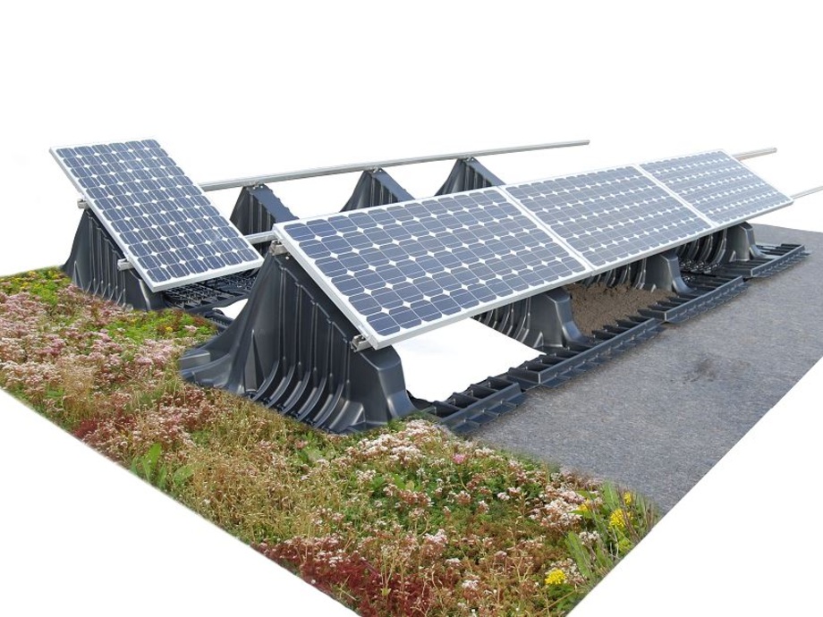 Optigrün's solar green roof is installed as a load-bearing system without roof penetration. For this purpose, the Sun Root photovoltaic mounting brackets are secured in position and protected against wind by the load of the green roof structure. One advantage of this system solution is that the photovoltaic supports do not penetrate the roof construction and sealing, nor do they impose heavy point loads.