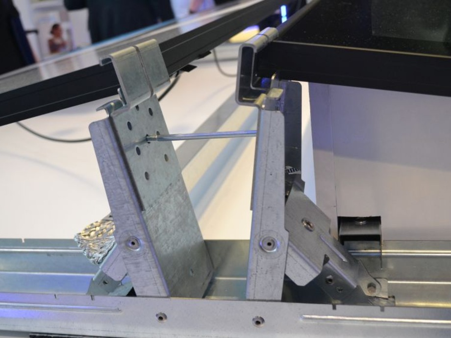 Another simplification: The technician places the panel into the slot of the middle support, connects the cables and then lets it slide into the already pre-assembled lower panel bracket. This then merely has to be positioned over the panel frame and screwed into place. A cross brace – as people used to the previous model should be well aware of – stabilises the array and prevents the system from shifting across the roof. It also serves as a gauge for setting the distances between the bottom rails. (mfo)