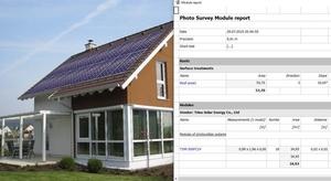 After calibration, measures like roof area or distances can be directly extracted from the image. Further the rooftop PV modules can be chosen from an extensive catalogue and visualized in the original image. A project report is generated automatically and can be handed over to the customer. In the example shown here 12 PV modules are accommodated onto the roof of a total area of 53,70 m² in south direction with a roof slope of 35°.