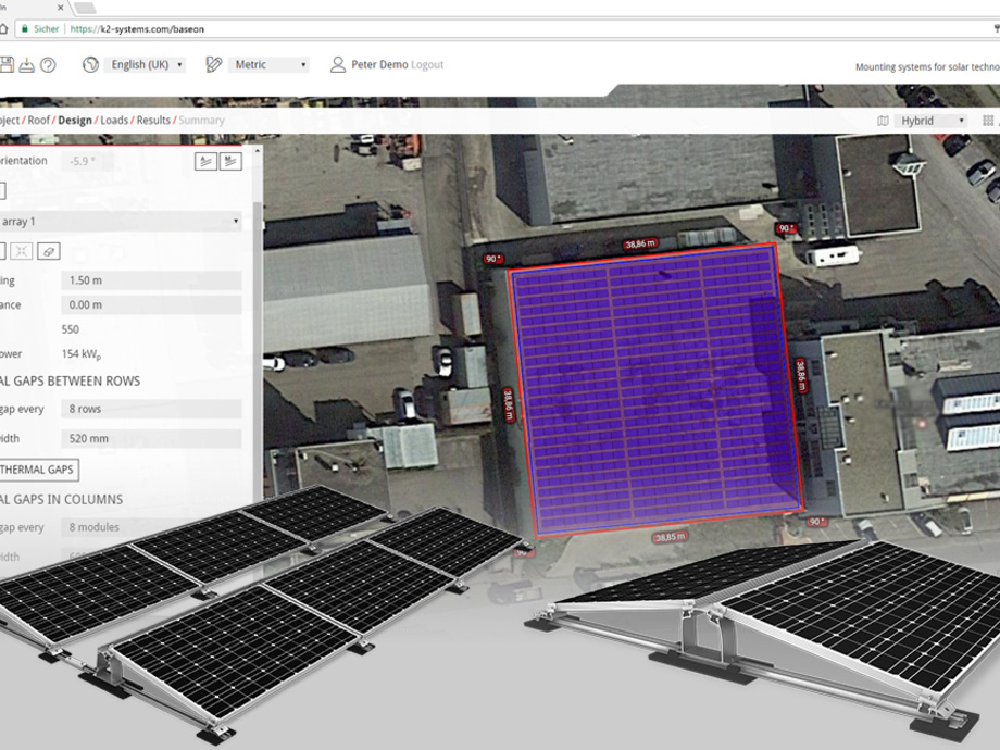 The online software accesses satellite images from google maps and facilitates a rapid surveying of the roof in question using the graphical drawing tools. Module fields and possible shading areas are also incorporated with just a few clicks and the corresponding snow and wind loads automatically calculated. The improved calculation basis, which also ensures lower ballast values among other things, is an additional benefit of this software.