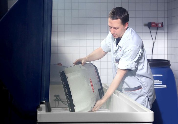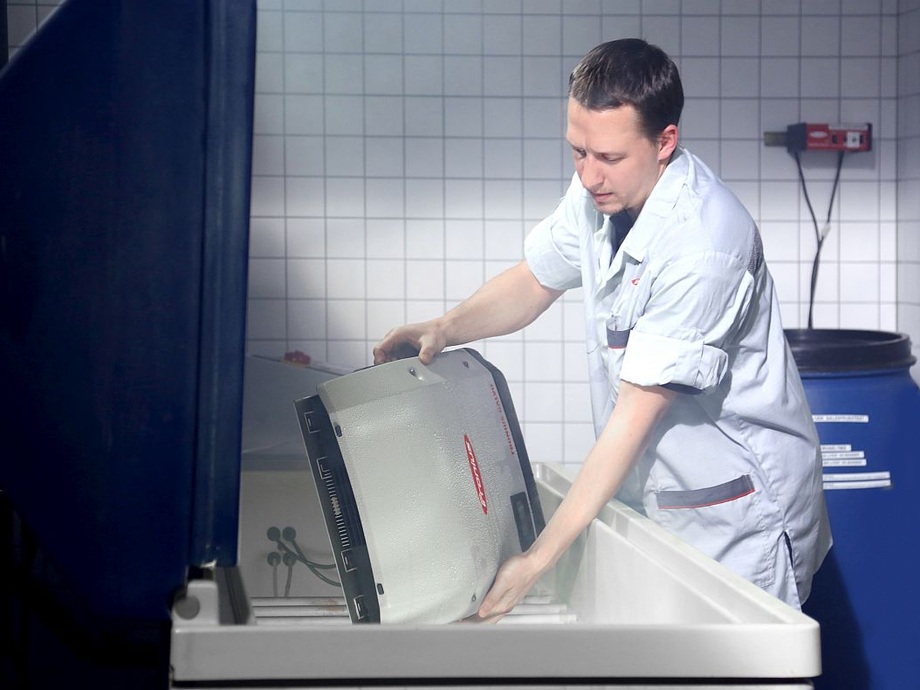 Since shading tends to be less of an issue that way, solar generators are generally mounted on roofs. Such rooftop installations are usually connected through string inverters, where a certain number of solar panels are combined to form a ring of panels (string) which is in turn connected to the DC input of the inverter. The DC voltage of the panel string usually does not exceed 1,000 volts. For large-scale rooftop installations on industrial buildings, up to 1,500 volts are possible. Small string inverters (up to ten kilowatts AC output) are usually optimised for self-consumption of the solar electricity. They can incorporate a storage battery. Larger string inverters have more than one MPP tracker and are configured strictly for feed-in installations. Few such units are pre-configured for storage batteries. Small string inverters can work without an internal transformer, whereas larger ones require so-called galvanic isolation, i.e. they have a built-in transformer to handle the connection to the grid. String inverters need to be installed by trained electricians, such as also do household electrics. These technicians are usually also qualified to install storage batteries and charge points for electric cars. (back to top)