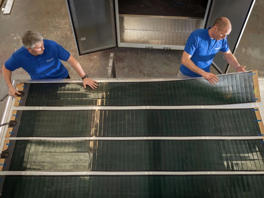 The flexible mats are lightweight, aerodynamic, durable and impact resistant. They weigh only two kilograms per square metre and are only three millimetres thin. An intelligent charge controller ensures excellent charging efficiency, while an integrated navigation device displays the vehicle's geolocation data in real time.