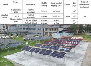The demonstration power station is equipped with monocrystalline and bifacial full-cell modules, monocrystalline and bifacial half-cell modules and purchased polycrystalline half-cell modules (PERC technology is adopted). All modules are retested by the CEI in order to use the actual power for single Wp power generation calculation. The details are as follows: