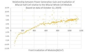 It can be seen from the statistics of a single month (October 2019) that the power generation of the half-cell bifacial module is weaker than that of the full-cell module due to irradiation differences on October 8 and 31, but power generation gains on all other days are positive, gains being generally positive related to the daily power generation.