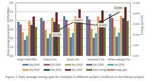 The average daily energy gain per module from September 2018 to April 2019 is shown in Figures 3 and 4. The data shows that compared with the single-sided PERC modules, the energy gains of bifacial PERC modules under the installation height of 1.5 meters are respectively 10.10%, 15.82%, 14.50% and 20.59% in the grass ground, sand ground, cement ground and white painted environments, which is in line with the trend that the higher the surface reflectance, the higher the energy gain. The energy gain is as high as 20.59% on the white painted surface with a reflectivity of 67.21%, and 10.10% on the grassland, which is higher than expected value.