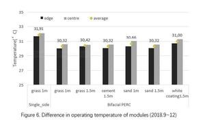 With two temperature sensors on the rear side of the modules, the operating temperature difference between bifacial modules and single-sided modules can be studied. Theoretically, on the one hand, the light received on the rear side for the bifacial modules will increase the operating current of the component to increase the module operating temperature. On the other hand, the transmittance of the bifacial PERC cell to the infrared radiation is higher than that of the single-sided cell, and the lowed thermal effect produced by the infrared radiation reduces the module operating temperature. From Figure 6, the operating temperature of all the bifacial modules on different surfaces (in the edge and middle of the modules) is lower than that of the single-sided modules. The average operating temperature of the bifacial modules on grass ground concrete ground and sand ground is 1.5C lower than that of the single-sided modules. The operating temperature of the bifacial modules on a white painted surface is 0.91C lower than that of single-sided modules. In addition to the infrared transmittance factor, it should be related to the 2mm + 2mm glass adopted by the LONGi bifacial modules, whose heat dissipation speed is significantly better than that of the 3.2mm glass + backsheet module.