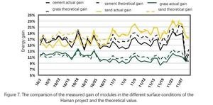 Figure 4 shows that when the installation height is increased from 1 m to 1.5 m, the energy gain of the bifacial modules gets significantly increased, the energy gains on the grass ground and sand ground increases by 2.23% (absolute value) and 3.40%, respectively, which meets the expectation: the higher the surface reflectance, the better the energy gain.