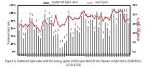 Next, take the sand land as an example to show the correlation between scattered light ratio and the energy gain. Since the scattered light can be directly received by the rear side of the modules, and the direct light is weakened by the surface reflection, the high scattered light ratio will increase the energy gain of the bifacial modules, and the lower the surface reflectance, the more obvious the effect. Figure 8 shows the energy gain and scattered light ratio from October 2 to November 30, 2018,which demonstrates that there is a significant correlation between the scattered light ratio and the energy gain. The date with high scattered light ratio tends to be more energy gain that the neighboring days.