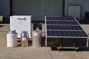 Phaesun offers a Milky Way kit with following components: A freezer with 166 ltr., a solar module with 150 W, a control unit, a battery AGM 65 Ah/12vDC, installation material, cables and connectors, module support structure, an isolated milk can with 40 ltr., plastic cups for 2kg ice each and a blow up LED lamp.