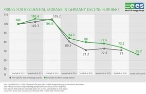 Lithium storage units are more effective, because they can be discharged to within 80 or 90 percent of their capacity. Some manufacturers even promise 100 percent, but that is pie in the sky. Lithium batteries are hermetically sealed, which makes installation easier. However, the price is in most cases higher than for lead batteries: approximately 700 - 1,000 euros (lithium iron phosphate cells) versus 500 euros (lead-acid cells), including battery management and charge control. Within the last four year prices for residental energy storage systems declined by 40 percent, for commercial storage systems by 50 percent and this trend is expected to continue. Soon lithium batteries will be on par with lead batteries. Back to top
