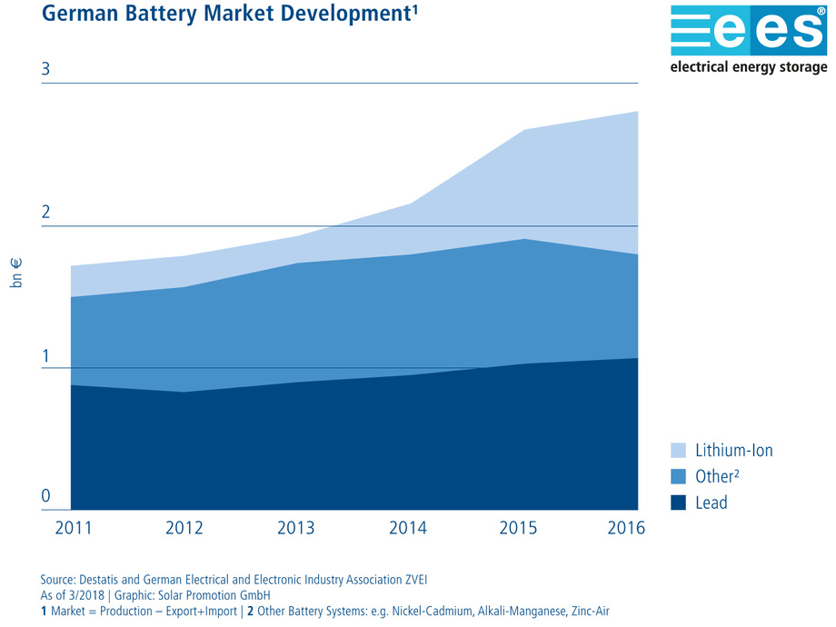 In order to meet growing demand, capacity for battery manufacture and assembly must be expanded and costs reduced so that more battery systems can reach the market more quickly. At the same time, the energy efficiency of the components should be increased. Along with China and Korea, European companies are increasingly getting involved in cell manufacturing with the goal of mass producing lithium-ion batteries – using innovative process technologies and materials. Otmar Frey, Managing Director of the Batteries Division of the German Electrical and Electronic Manufacturers’ Association, a conference partner of the ees Europe Conference, sees Germany too as a market participant that should be taken seriously. “The German battery industry has the expertise to produce ready-to-use batteries from lithium-ion cells, for example to be used in domestic storage systems for photovoltaic installations. Between 2011 and 2016, the German market grew from 1.7 to 2.8 billion euros. These figures offer clear evidence that the market can keep pace.”